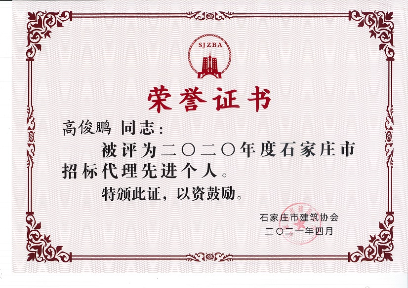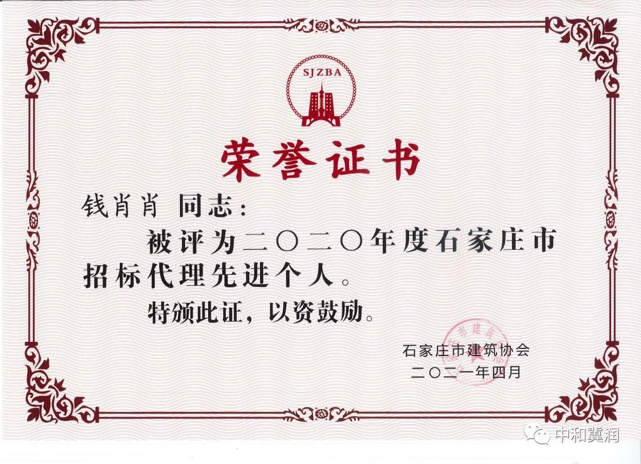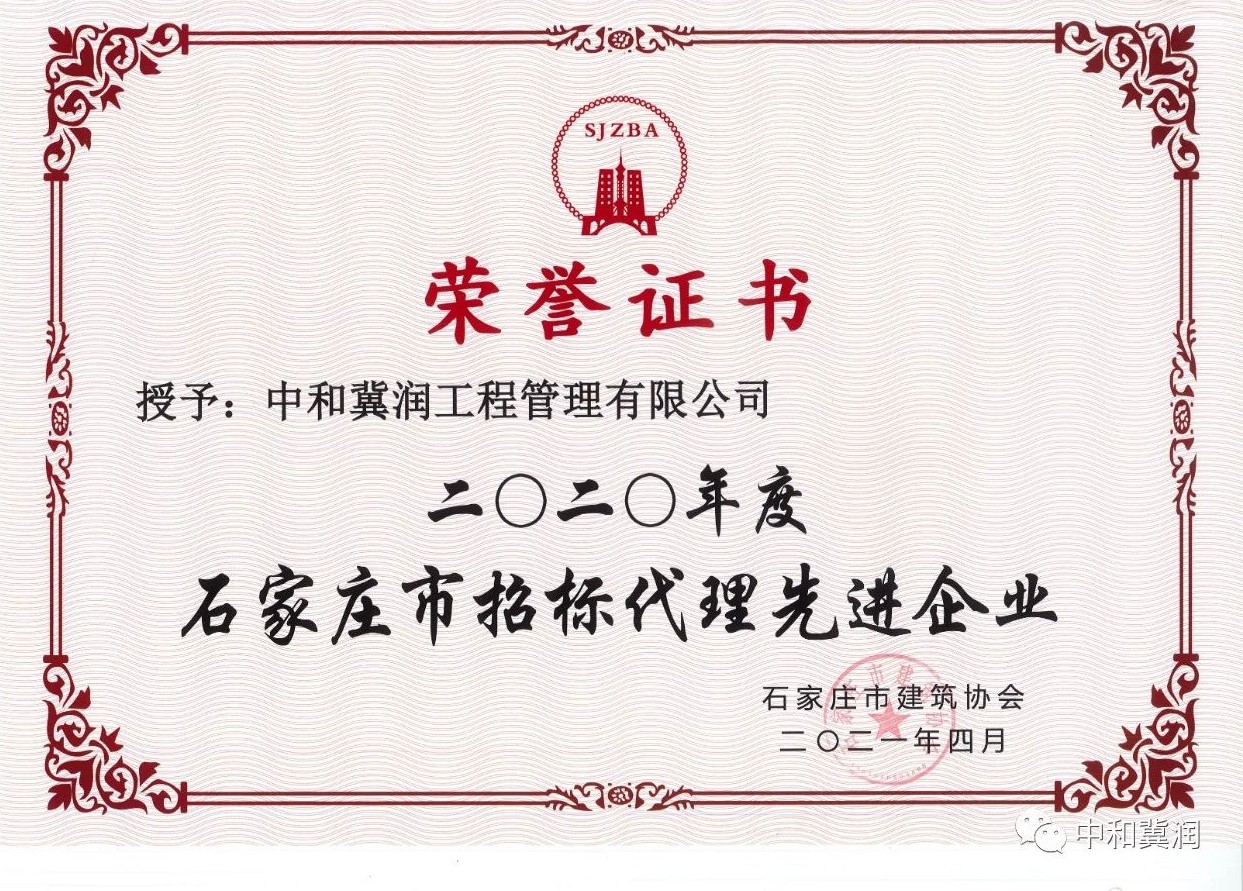 2021年6月8日中和冀润工程管理有限公司相关人员参加了石家庄市建筑协会招投标专业委员会四届二次会员大会。我公司被授予2020年度“招标代理先进企业”,公司副总高俊鹏、钱肖肖荣获2020年度“招标代理先进个人”荣誉称号。